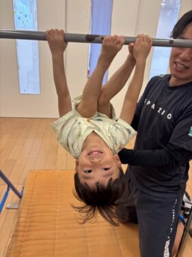 最初は先生の力を借りて逆さまににぶらーん✨にこにこ笑顔で余裕があります💪