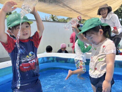 次はコップを持ってきてジュース屋さん🍹プールの縁で落ちないように丁寧にお水を入れていきます👀