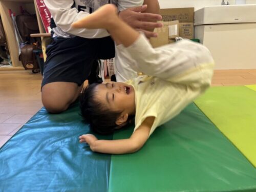 最後はでんぐり返り😳「手と頭を地面につけてお腹を見ながらごろーんします」と先生の教えを守って上手にでんぐり返しが出来ました👏