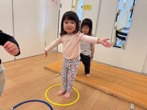 輪っかの中を歩いたり、うさぎ跳びをしたり♩