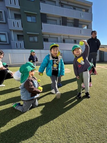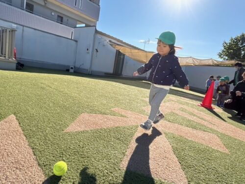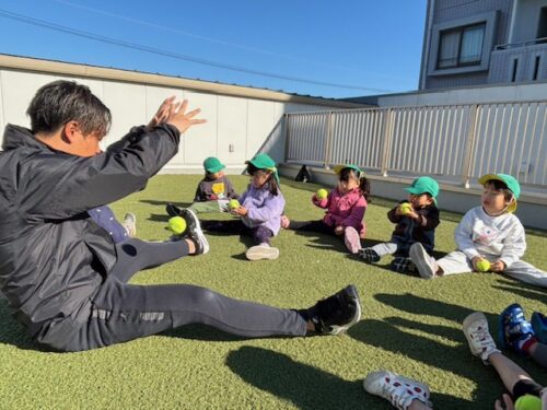 一人一つテニスボールをもらって、落としてキャッチすることに挑戦しました