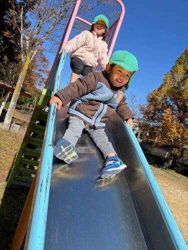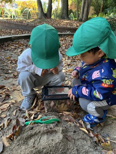 体操教室のあとは、裏山公園へ行きました虫かごにたくさんの落ち葉やドングリ、ダンゴムシなどを入れて遊んでいるお友だちがいました
