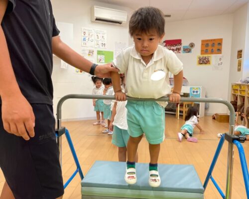 マットの上ででんぐり返しをしたり、鉄棒に挑戦したりしました