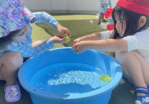 その後の水遊びでは「ひよこさんを押すと水が出てくるんだよ」というお友だちの言葉を聞いて一緒に押し出してみたり。。。