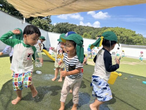ホースで作った水溜まりの上でみんなでジャンプ💦みんな笑顔でとても楽しそう😊