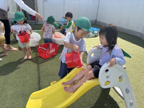 お友だちにお水を流してもらいながらすべり台をしました✨セルフウォータースライダーです☺️