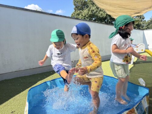 ミニプールでは、飛んだり跳ねたり、水を蹴ったりして感触を楽しみます🎵