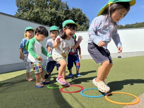 フラットフープから落ちないように上手にジャンプ🏃♂️みんな並んで順番にスタートです👀