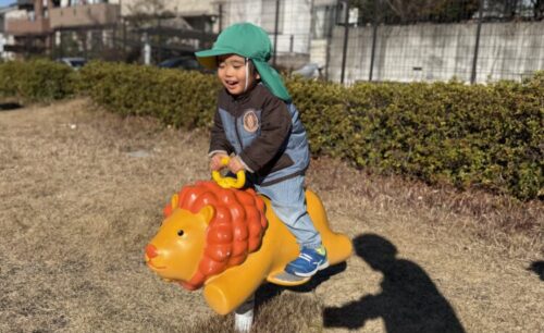 「先生見てー‼️お馬さんに乗ってるよー‼️」と、かっこいいポーズでスイング遊具で遊ぶうさぎ組さん🐰気分はまるでジョッキーです🏇