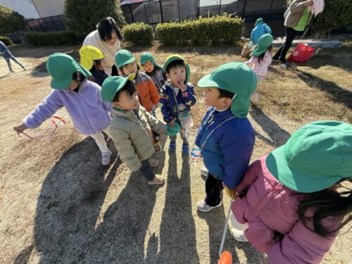 「あけましておめでとうございます🎍」とライオンさんに元気にご挨拶を済ませて、早速すべり台へ向かううさぎ組さん🛝「先生見て見て‼️」と指の先には氷が張っていました😳氷を手に取り、「冷たいよ‼️先生も触ってみて‼️」と感触を楽しんでいました🧊