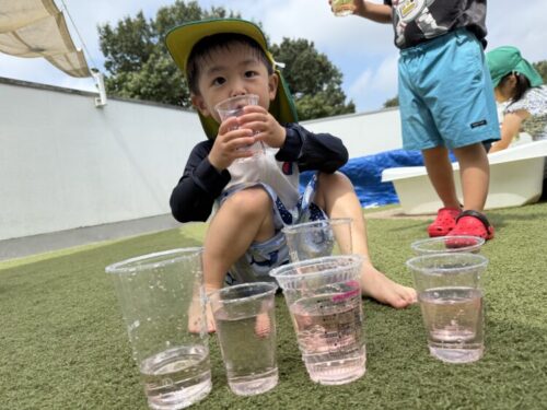 赤色、黄色、水色のプールが完成し、色水遊びの開始です🙌「見て見てりんごのジュースできたー」「これはソーダ味のジュースなんだよー」とコップに入れた色水で好きなジュースを作るうさぎ組🐰