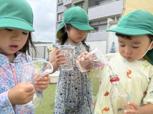 違う色の色水を混ぜると色が変わることを発見💡「色が変わるから見ててよ‼️」とお友だちに見せてあげていました🥰