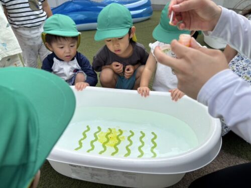 今日の水遊びでは、初めての色水遊び👀魔法の粉を持って屋上へ出発🏃‍♂️💨