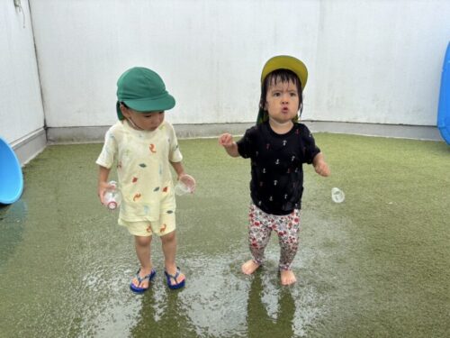 噴水プールでは、穴から勢いよく飛び出る水に大興奮💦「キャー❗️」「冷たーい‼️」と、とても楽しそうに遊ぶうさぎ組🐰プールの中を飛んだり、飛んでくる水を掴もうとしたり、穴を塞いで水を止めたり色々な遊び方をしました🌈