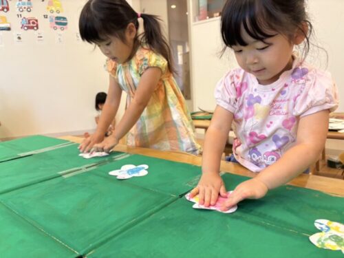 重ならないように上手に貼っています👀運動会まで残り2週間❗️みんなで準備を進めて行きます👊
