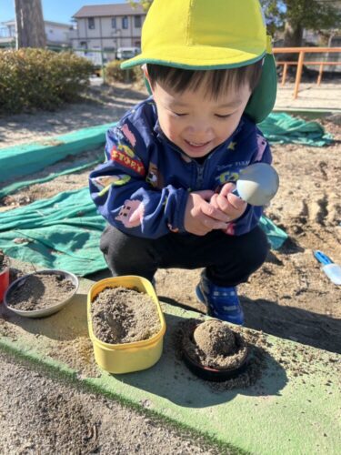 丸いスプーンに砂を詰めて上手にひっくり返していました🎵