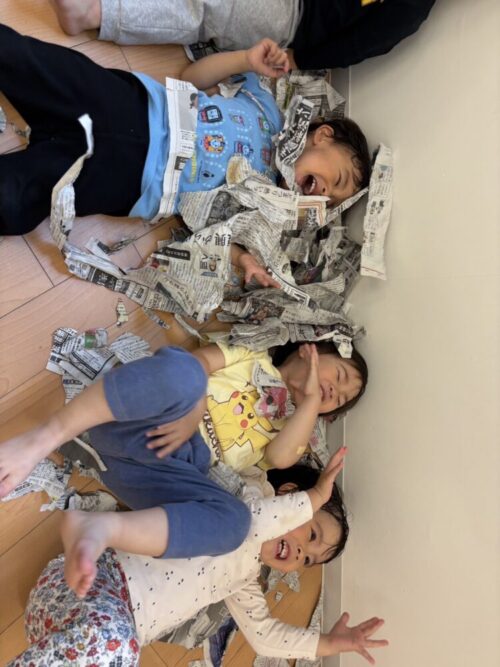 うさぎ組では新聞紙を使ってビリビリ破ったり、花吹雪のように飛ばしたり、上に寝転んだり…
