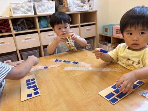 また、プチプチにビニールテープを貼って、雨の製作もしました☔指先を器用に使って、テープを剥がしたり貼ったりして楽しく取り組んでいました![]()