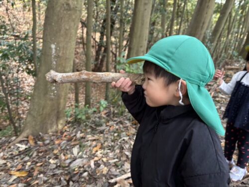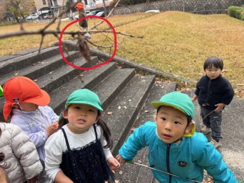 そのあとは裏山公園へ!そして、ミノムシを発見ガの幼虫さんが葉っぱや木の枝を糸で巻き付けてお家を作っているんだよと伝えると「ひとりで作ったの?」と興味津々で観察していました