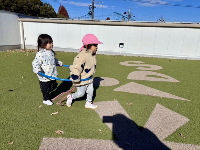今日は屋上でトランポリンや滑り台、しっぽ取りをして遊びました。