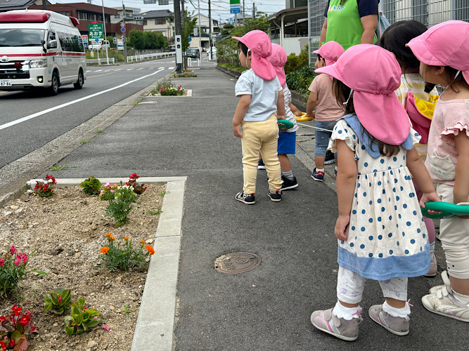 お散歩に行く途中救急車に遭遇🚑「ラッキー✌️」と話をする子どもたちです😆