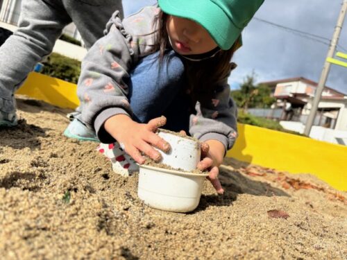 朝少し雨が降ったようで、砂場のお砂が“シャコシャコ”と鳴って感触が気持ち良かったね型抜きもしやすい柔らかさでした