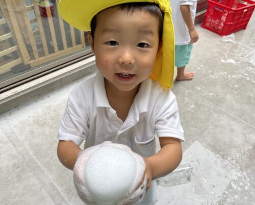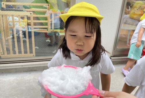 泡をすくって勢いよく『フー』っと息を吹きかけて飛んでいく泡を楽しんでいたりと初めての泡遊びを楽しんでいたぱんだ組のお友だちでした![]()