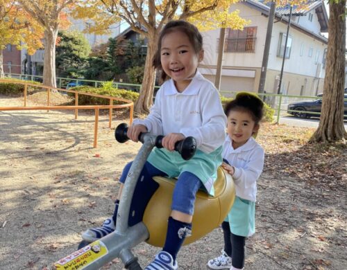 この公園の人気遊具シーソーも「きゃははは」と楽しそうな声が毎回聞こえてきて保育者も思わず笑顔になっています![]()