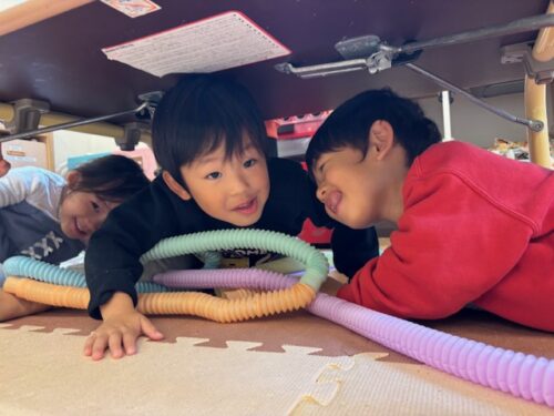 今日は朝からポップチューブを使ってみんなで楽しそうに遊んでいました