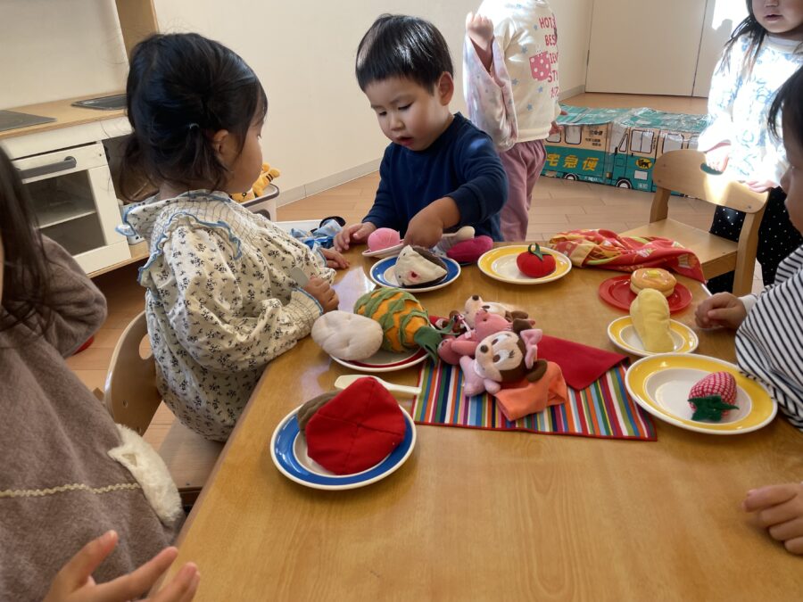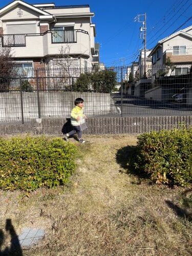「鬼だぞー!!」と鬼ごっこ(オオカミごっこ🐺)をして走り回る子どもたちです。
