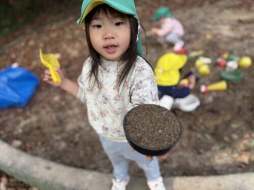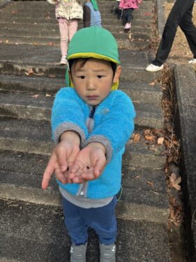 お砂場で遊んでいると、砂の中にどんぐりを発見👀とても嬉しかったようで、保育者に「どんぐりあったよ‼️」と公園中を走って教えてあげていました☺️