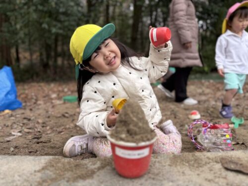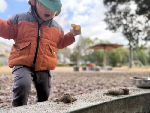 飛行機の型を使って、お砂場の縁で飛行機作り✈️ぎゅーっといっぱいに砂を詰めて、「ぱっかーん‼️」と口に出して、いざ緊張の瞬間です👀