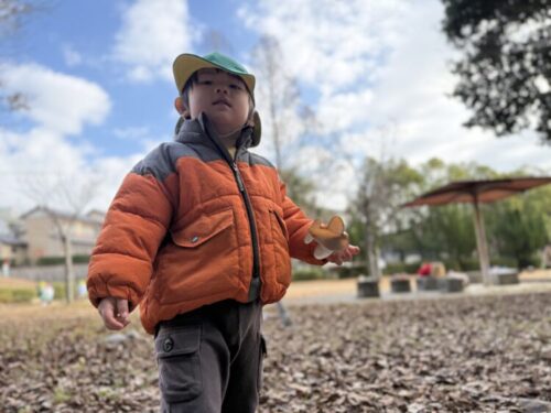 公園に着いたら早速ダンゴムシ探しです🔍階段の横にいるダンゴムシを捕まえて、「ダンゴムシいた‼️」と両手を見せてくれました🤲