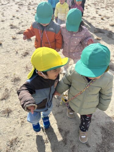 グランドに着いてから進級(パンダ🐼組)に向けてお友だちと手を繋いで歩く練習をしました😊