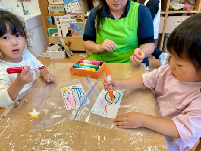 昨日の夕刻、順番に油性ペンを使ってお散歩バック製作をしました🖋️🛍️