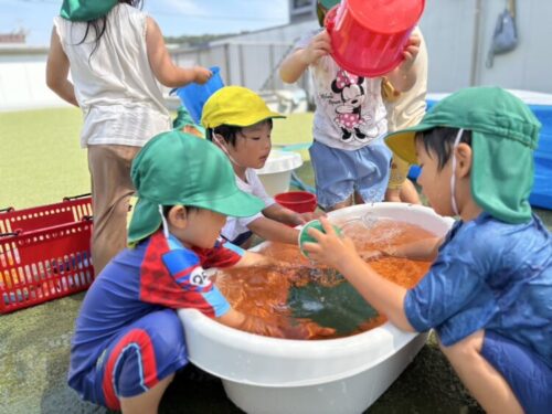 オレンジ色の色水が大人気❗️コップやペットボトル、バケツにたくさん入れて楽しんでいました🌈
