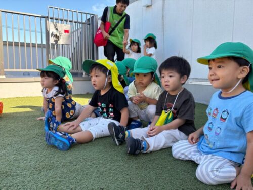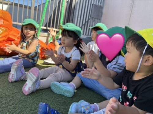 さっそく屋上へ🏃‍♂️幼児さんのパラバルーンやダンス、ハンバーガー競争に興味津々のうさぎ組🐰