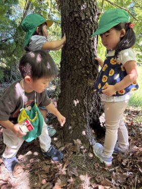 木に集まって虫探し🔍みんなで協力して、どこだどこだーと探していきます👀