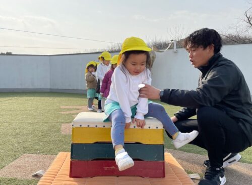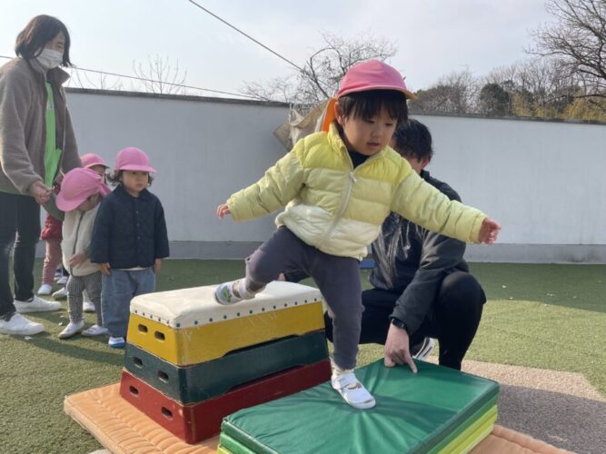 最初は怖がっている子もいたけどお尻をつけても大丈夫だと聞き積極的に挑戦する姿が見られ成長を感じました