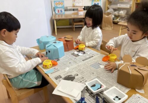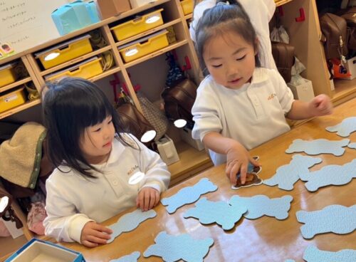 発表会の動物の帽子に顔や耳をつけてあげたりとゆったりと遊んでいました