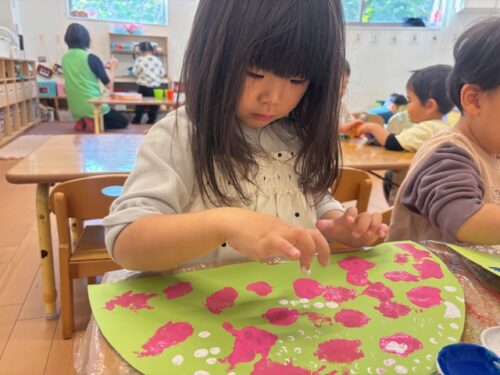 昨日からクリスマス製作で絵の具遊びをしています🎄クリスマス会で被るパーティ帽子を製作中ですよ🎅