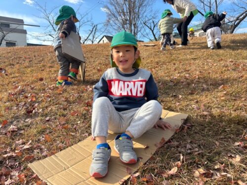 今日は「またやりたい!」という声もあり、植田山公園へ行って芝滑り遊びを楽しみましたよ