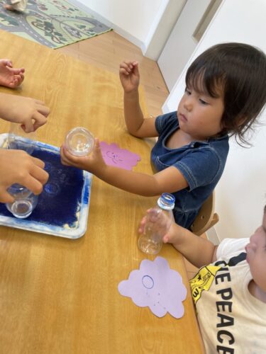 ぶどうスタンプ製作やトランポリン等コーナー遊びをしました。