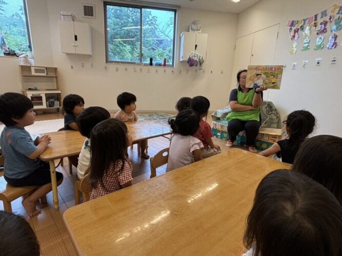 朝の会では、台風🌪️が近づいてきているので台風の紙芝居を読みました。