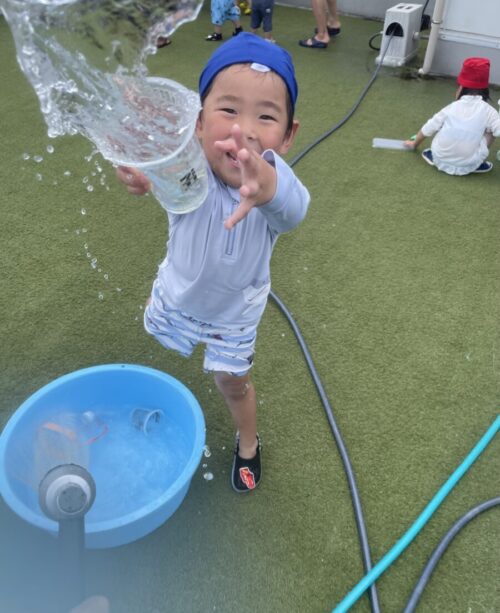 プールから上がっても元気いっぱいで保育者と水の掛け合いをしたり、色水遊びをしたりと楽しんでいましたよ
