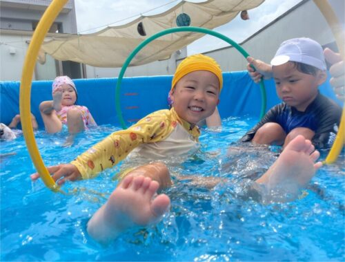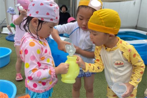 水遊びでは友だちと一緒に水を貯めたり、金魚を使って金魚すくいをしたりと好きな遊びを楽しんでいましたよ![]()