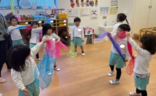 スカーフを使って凧あげをイメージした動きをしたり。。。