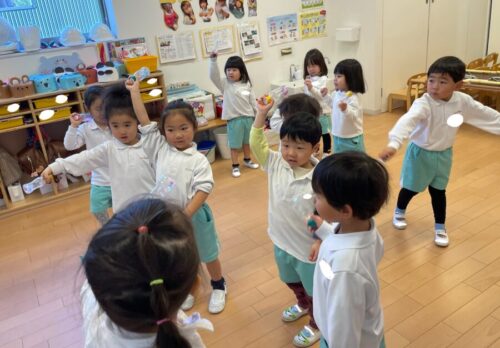 今日は元気な声で新年の挨拶を講師の先生と行い、今年初めてのリトミックをしました♪