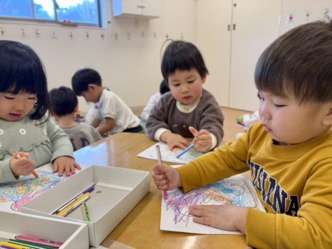 「〇〇ちゃんのおなかの鬼はどんな鬼かな?」と楽しそうに塗る子供たちです🥰