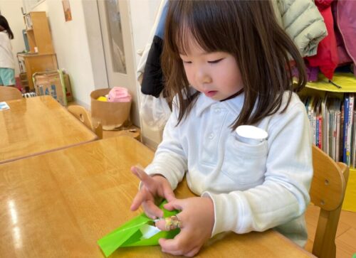 リトミックの後はうさぎさんにお客さんになってもらいながら発表会の練習をしたり、小道具を作ったりして過ごしました